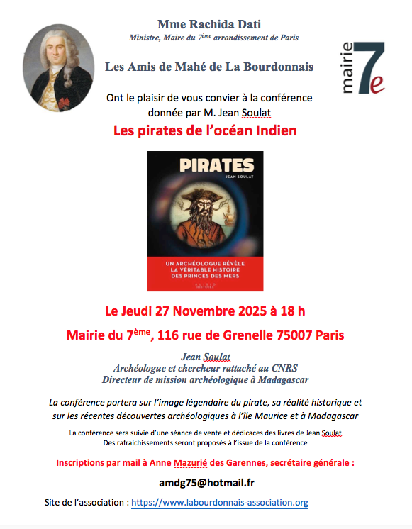 1) Conférence le jeudi 27 novembre 2025, en salle des fêtes, sur « Des pirates en Océan Indien » par Jean Soulat , archéologue, spécialiste de ce sujet. Il a participé à des fouilles au large de l’Ile Maurice et à Madagascar. Auteur de « Les Pirates, de la Légende à la Réalité Historique ».
