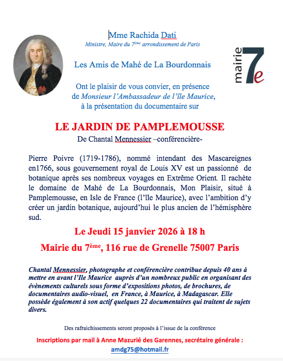2) Une conférence très illustrée,  le 15 janvier 2026, en salle des fêtes, sur « La Bourdonnais et Le jardin tropical de Pamplemousses à L’Ile Maurice », par Chantal Mennessier, photographe et conférencière qui est déjà intervenue à la mairie du VII ème dans le cadre de nos conférences.